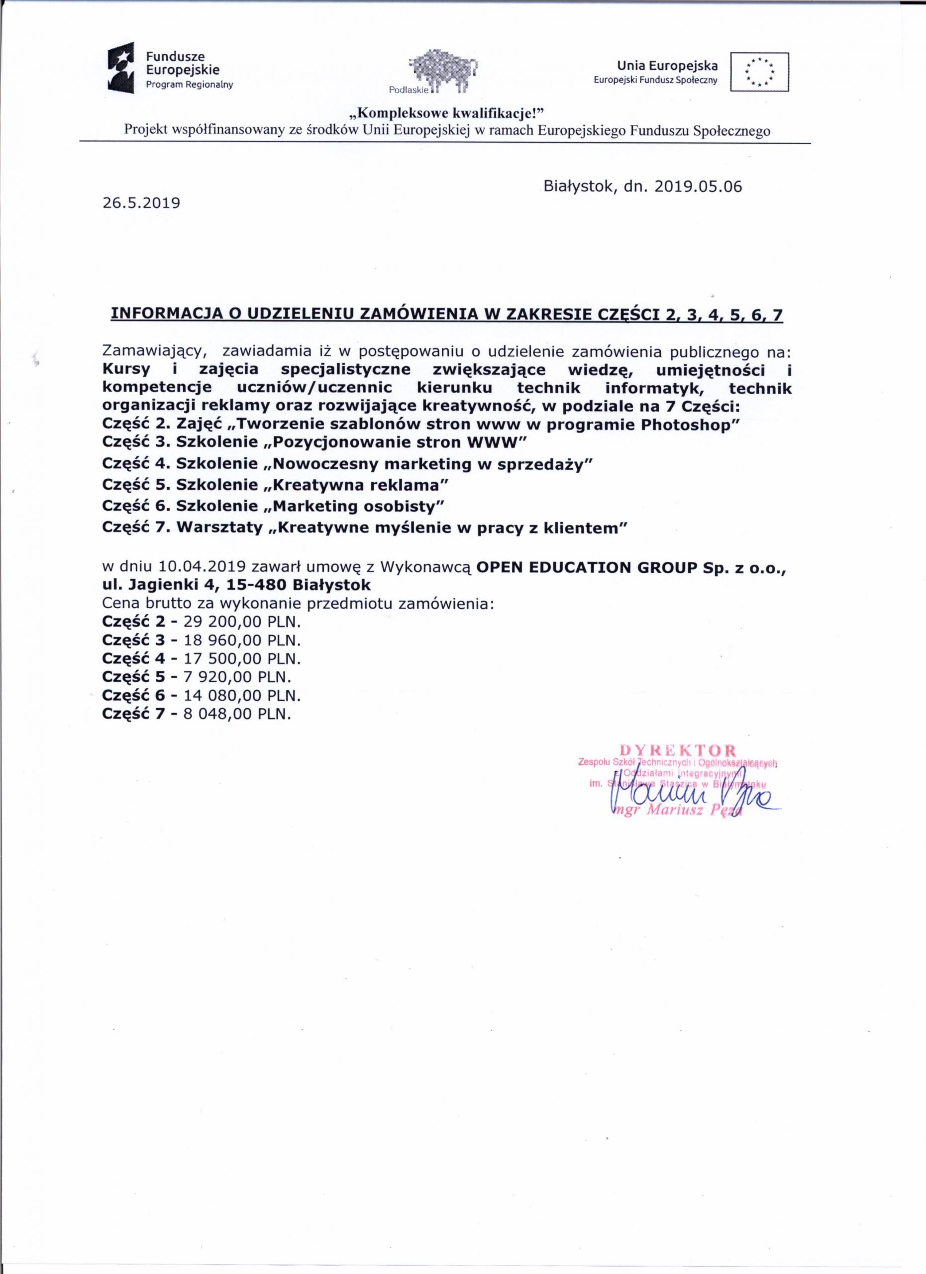 Informacja o udzieleniu zamówienia w zakresie cz.2,3,4,5,6,7.