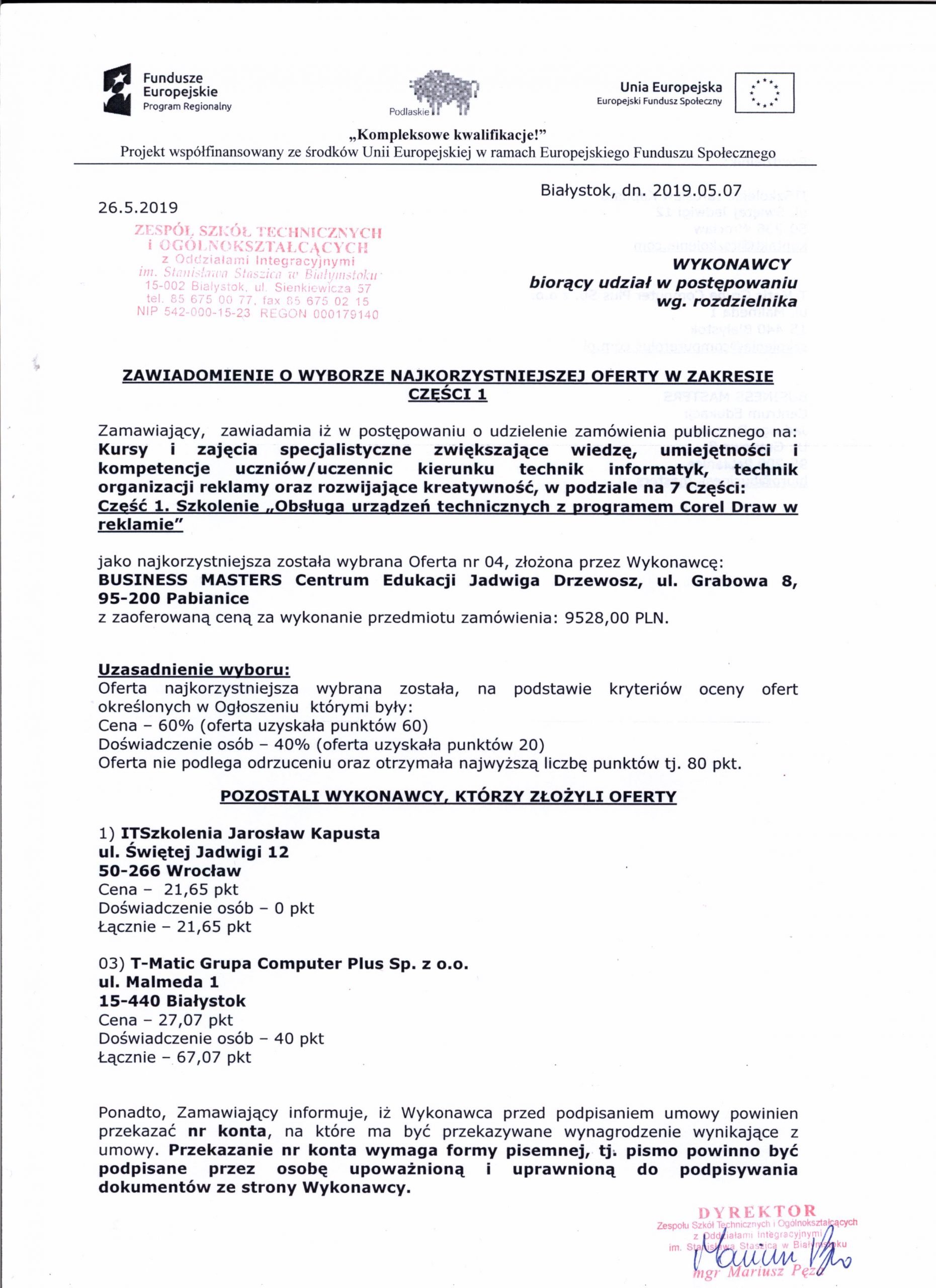 Zawiadomienie o wyborze najkorzystniejszej oferty w zakresie cz. 1.