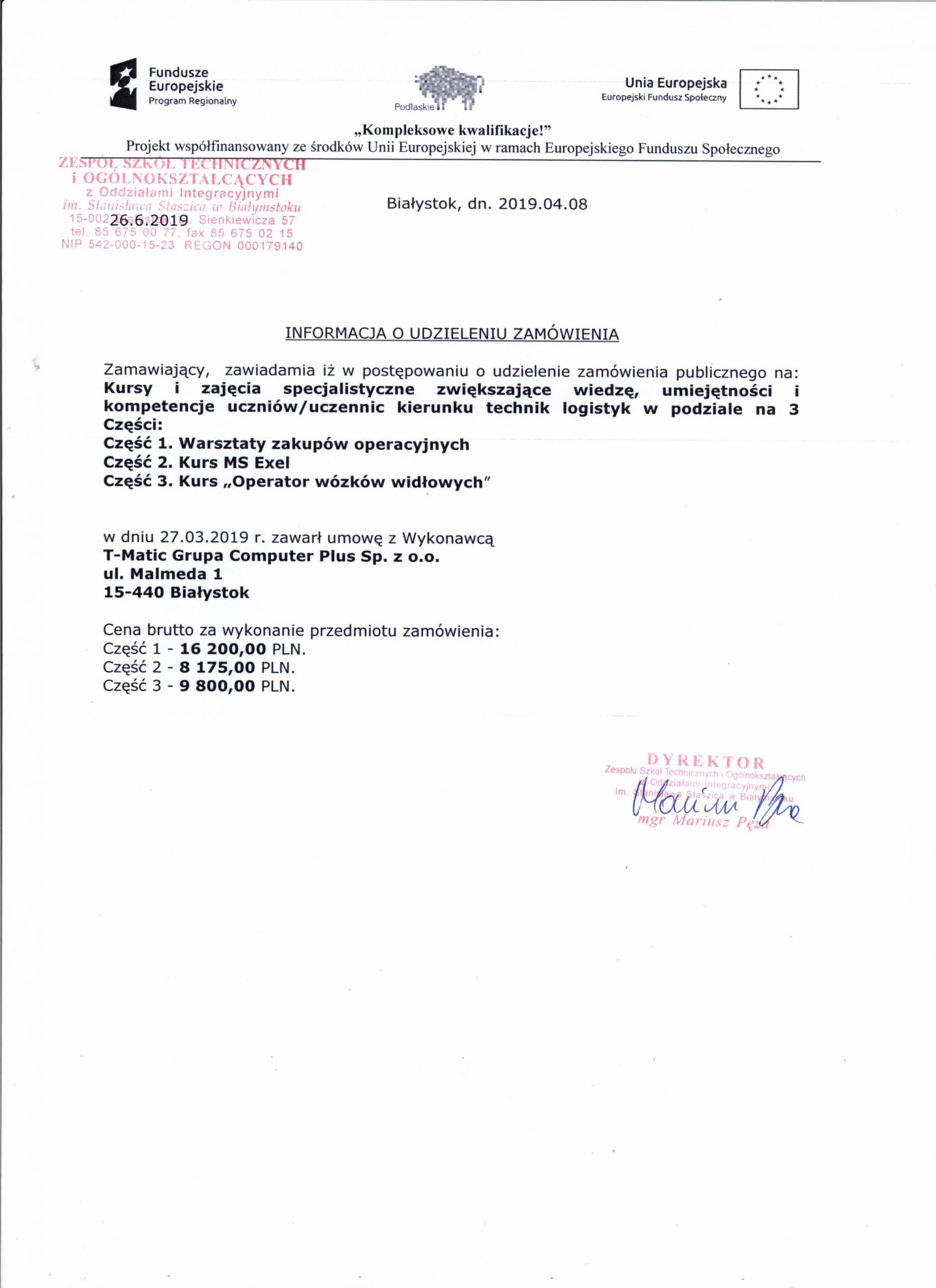 Kursy i zajęcia specjalistyczne zwiększające wiedzę, umiejętności i kompetencje uczniów/uczennic kierunku technik logistyk w podziale na 3 Części