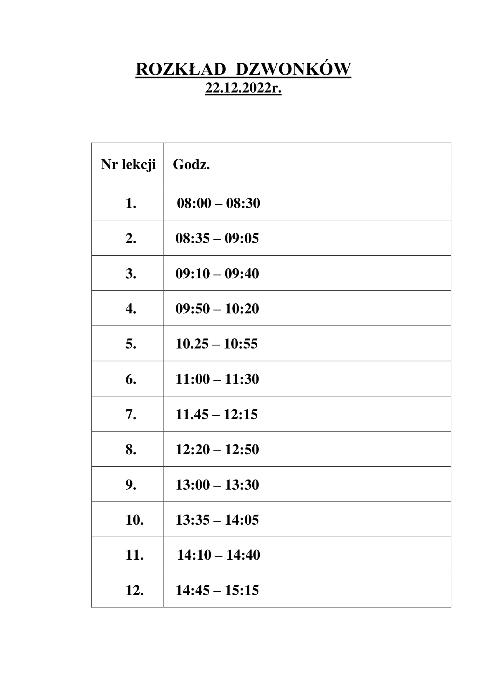 Przypominamy, iż 22 grudnia 2022 r. obowiązuje w naszej szkole zmieniony rozkład dzwonków.